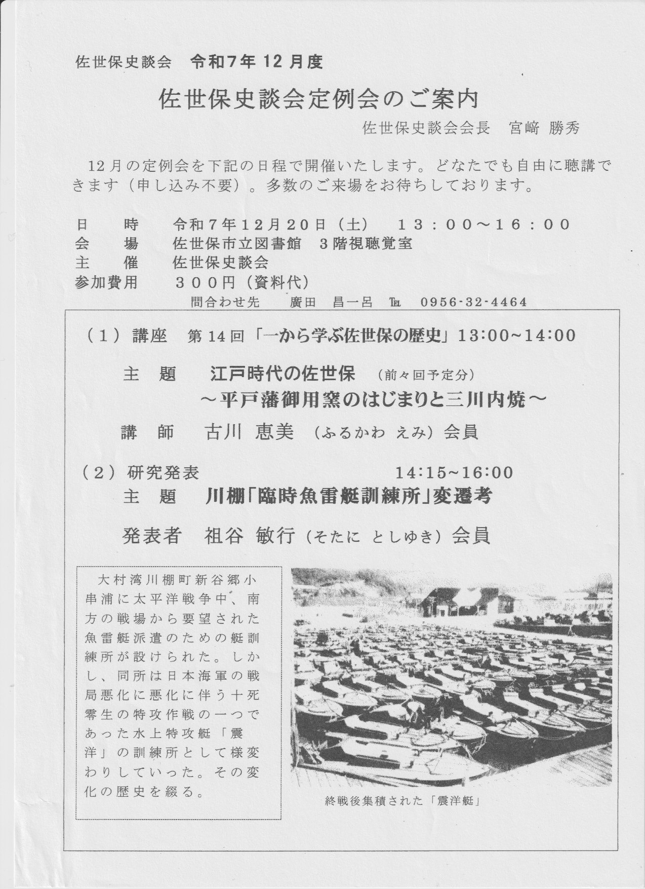 A令和7年度佐世保史談会総会(14:15〜15:30)のため定例研究発表会は中止です。